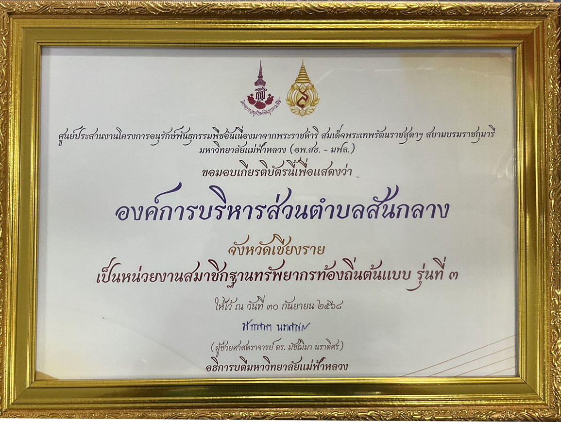 วันอังคารที่ 30 กันยายน 2568 นายอลงกรณ์ ดีน้อย นายกองค์การบริหารส่วนตำบลสันกลาง ได้มอบหมายให้นางสุกัญญา ชุ่มอินจักร์ หัวหน้าฝ่ายบริหารงานทั่วไป และเจ้าหน้าที่งานเกษตร ร่วมประชุมและรับมอบเกียรติบัตร "หน่วยงานสมาชิกงานฐานทรัพยากรท้องถิ่นต้นแบบ" ณ ศูนย์ประสานงาน อพ.สธ. มหาวิทยาลัยแม่ฟ้าหลวง