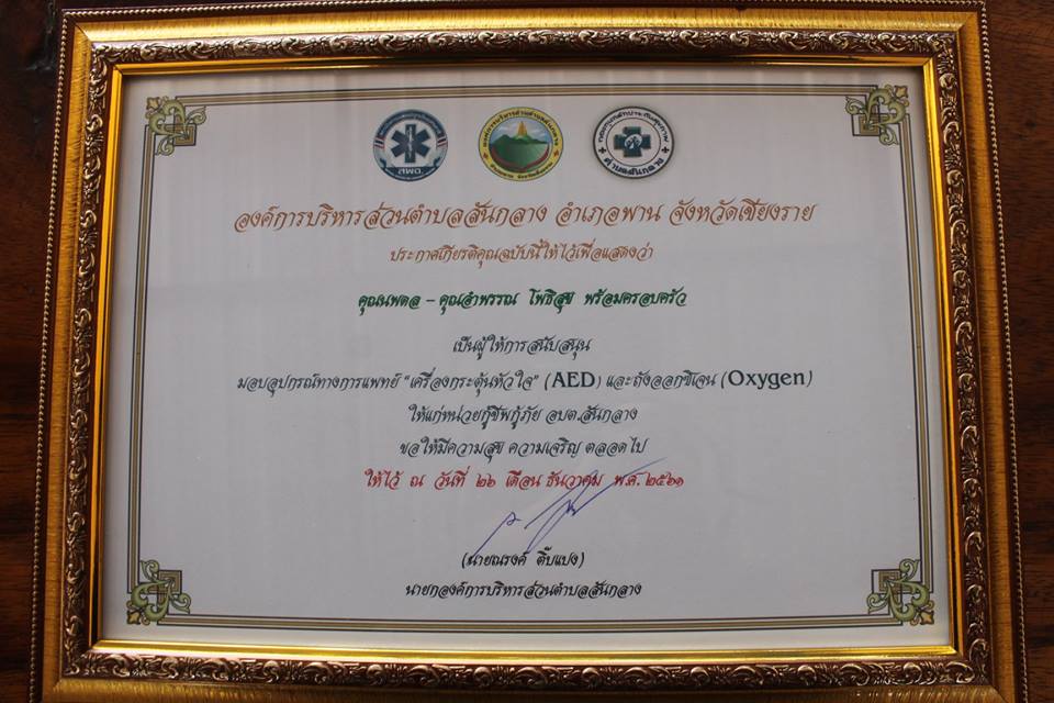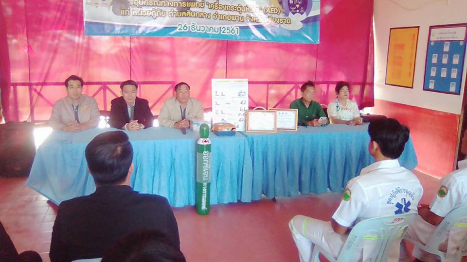วันที่ 26 ธ.ค.61 ศูนย์กู้ชีพ อบต.สันกลาง ได้รับมอบอุปกรณ์การแพทย์ เครื่องกระตุ้นหัวใจ (AED) และถังออกซิเจน จากคุณนพดล - คุณอำพรรณ โพธิสุข พร้อมครอบครัว และกลุ่มโรงแรม BED HOTEL ,POR HOTEL ,CAMP Chiangmai โดยมีนายก อบต. และกำนัันตำบลสันกลาง และผู้แทนจากโรงพยาบาลพาน เป็นผู้ร่วมการรับมอบ