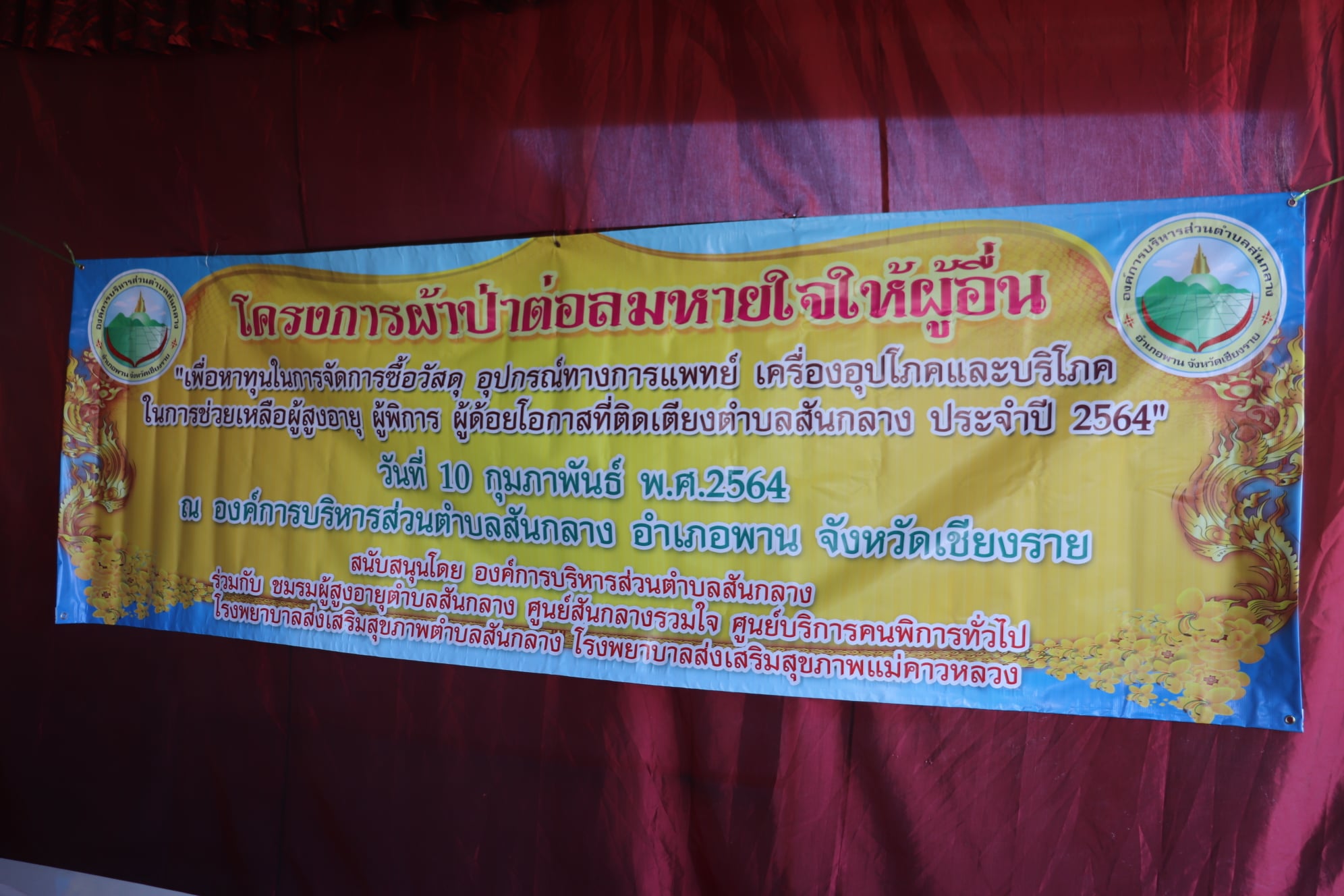 วันที่ 10 กุมภาพันธ์ 2564 ชมรมผู้สูงอายุตำบลสันกลาง ศูนย์สันกลางรวมใจ ศูนย์บริการคนพิการทั่วไป โรงพยาบาลส่งเสริมสุขภาพตำบลสันกลาง/บ้านแม่คาวหลวง และ อบต.สันกลาง ได้จัดทำโครงการทอดผ้าป่าต่อลมหายใจให้ผู้อื่น เพื่อหาทุนในการจัดซื้อวัสดุ อุปกรณ์ทางการแพทย์ เครื่องอุปโภคบริโภค ในการช่วยเหลือผู้สูงอายุ ผู้พิการ ผู้ด้อยโอกาสที่ติดเตียง ประจำปี 2564 ขอขอบคุณผู้นำท้องที่ท้องถิ่น ส่วนราชการ และพี่น้องประชาชนทุกท่าน ที่ร่วมทำบุญทอดผ้าป่าศูนย์สันกลางรวมใจ ทุนทรัพย์ที่ได้ทางศูนย์ฯจะนำไปจัดซื้อวัสดุอุปกรณ์ฯ เพื่อช่วยเหลือผู้ป่วยตามวัตถุประสงค์ของศูนย์สันกลางรวมใจต่อไป