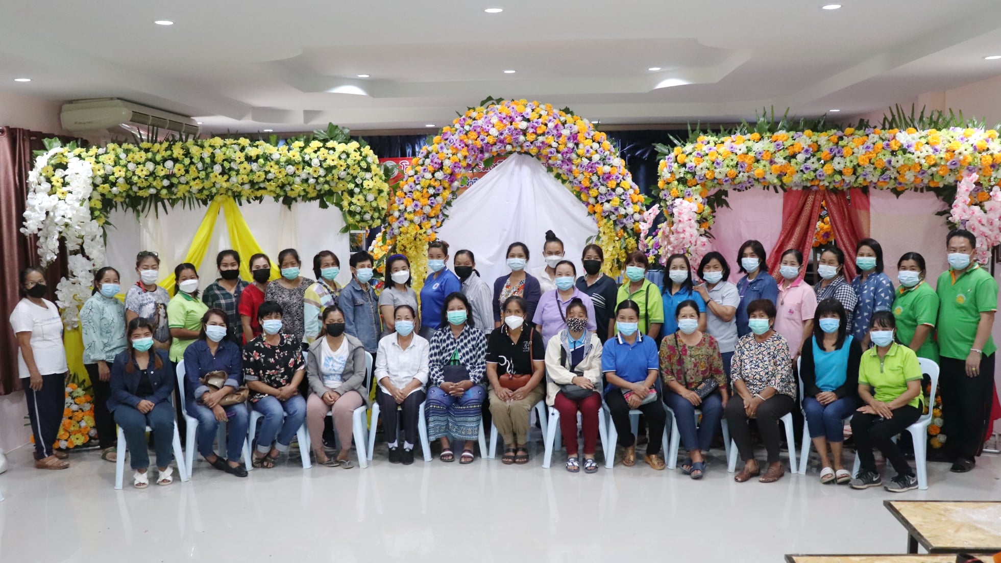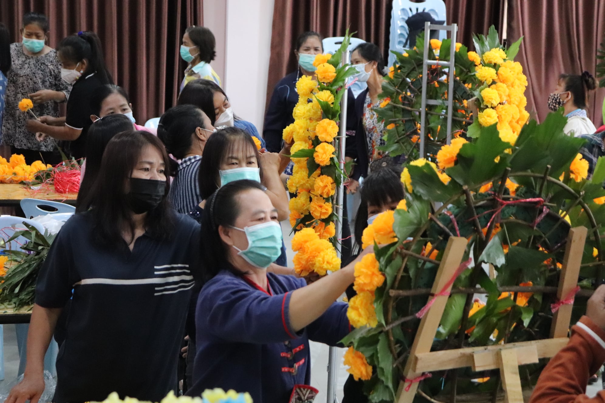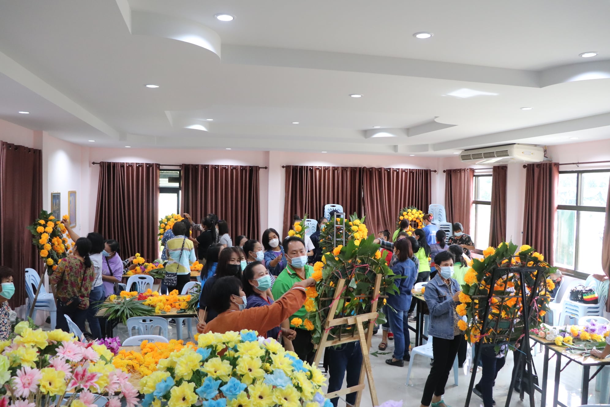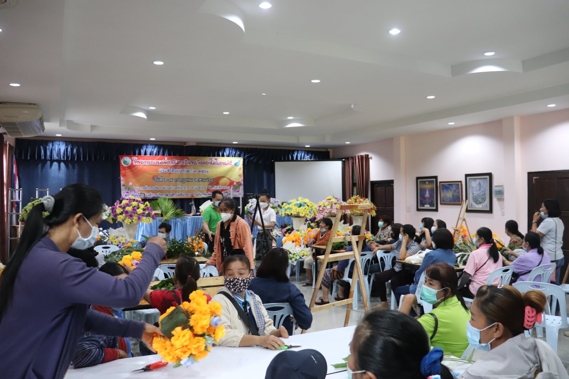 งานพัฒนาชุมชน อบต. ร่วมกับ กลุ่มพัฒนาสตรีตำบล จัดอบรมส่งเสริมอาชีพจัดดอกไม้ในงานพิธี
