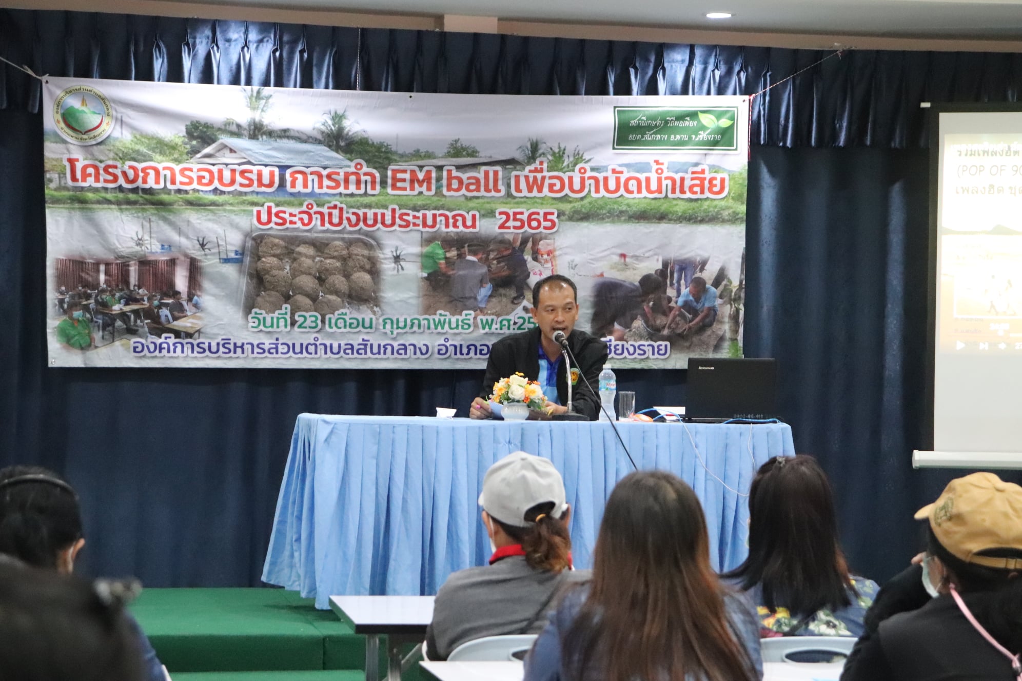 โครงการอบรมการทำ EM Ball เพื่อใช้ปรับปรุงคุณภาพน้ำ . วันที่ 23 กุมภาพันธ์ พ.ศ.2565 . นายอลงกรณ์ ดีน้อย นายกองค์การบริหารส่วนตำบลสันกลาง กล่าวเปิดโครงการอบรม EM Ball ให้กับตัวแทนเกษตรกรในพื้นที่ จัดอบรม ณ ห้องประชุม อบต.สันกลาง ซึ่งในการอบรมได้เชิญวิทยากร นางสาวเบญจวรรณ ใจจันทรา นักวิชาการส่งเสริมการเกษตรปฏิบัติการ สำนักงานเกษตรอำเภอพาน เป็นวิทยากรให้ความรู้แก่เกษตรกรทั้งในภาคทฤษฎีและภาคปฏิบัติ . EM Ball เหมาะสำหรับการเลี้ยงปลาทั้งในกระชังและบ่อดิน วิธีใช้โดยการโยนลงในบ่อตารางเมตรละ 1 ลูก จะช่วยปรับสภาพแวดล้อม และคุณภาพน้ำในบ่อเลี้ยงให้มีคุณภาพดี อย่างสม่ำเสมอ ช่วยย่อยสลายสิ่งหมักหมมที่ก้นบ่อ ช่วยให้สภาพน้ำในบ่อเหมาะสมต่อการเลี้ยงและการเจริญเติบโตของปลา สามารถใช้ได้กับการเลี้ยงปลาน้ำจืดทุกชนิด