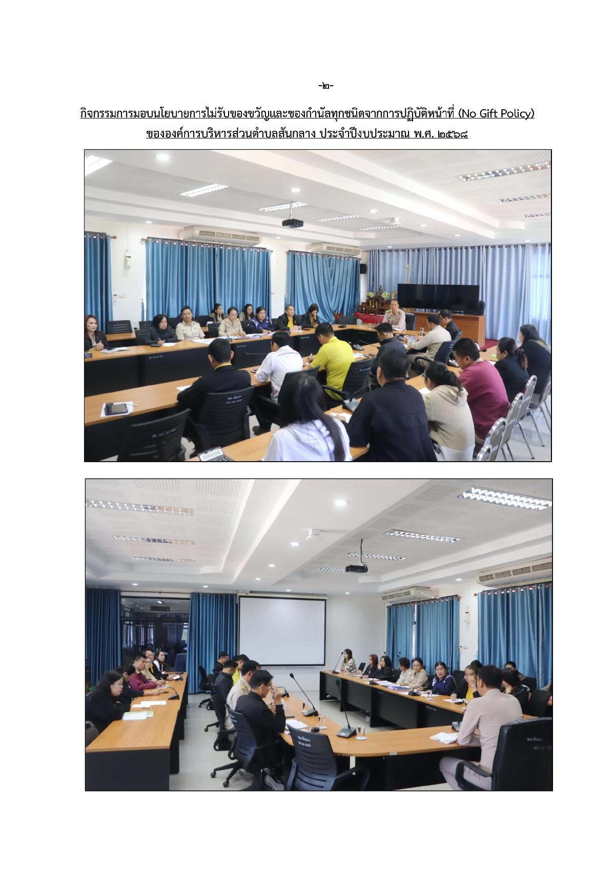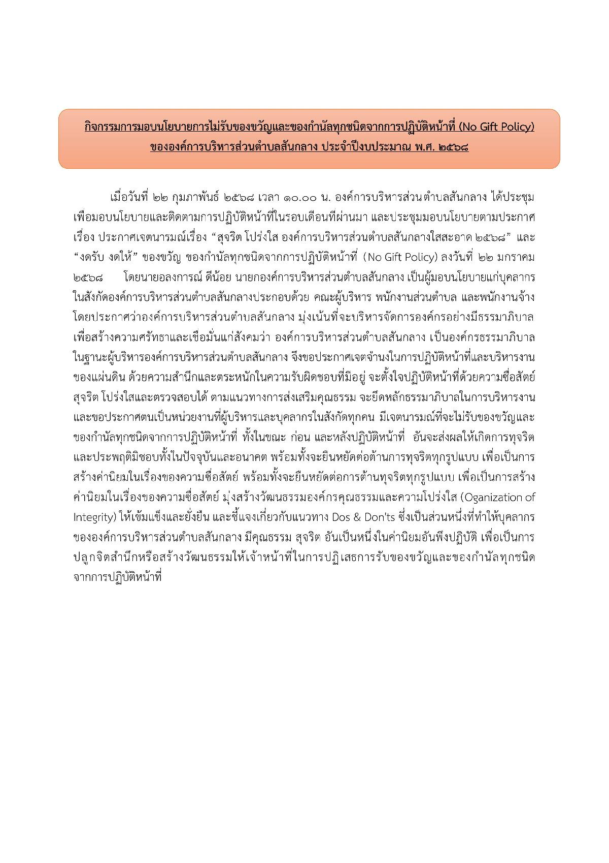 กิจกรรมการมอบนโยบายการไม่รับของขวัญและของกำนัลทุกชนิดจากการปฏิบัติหน้าที่ (No Gift Policy) ขององค์การบริหารส่วนตำบลสันกลาง ประจำปีงบประมาณ พ.ศ. 2568