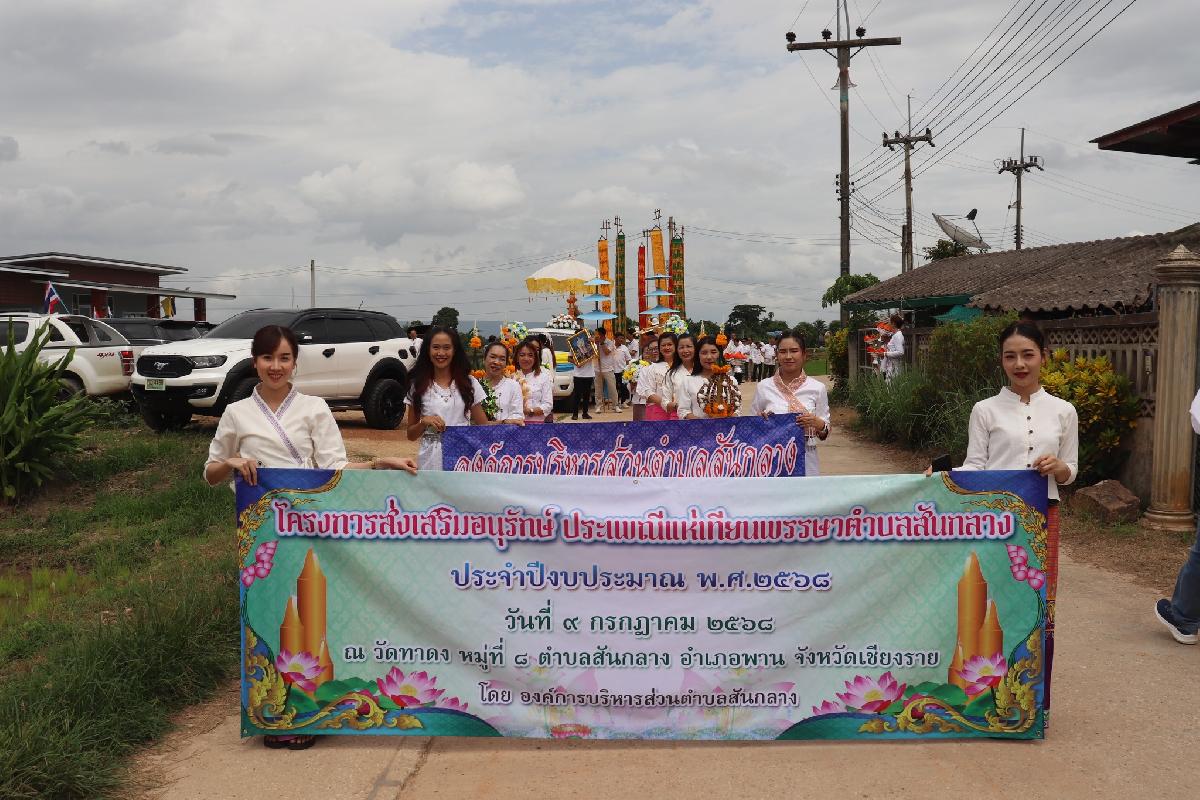 วันที่ 9 กรกฎาคม 2568 ณ วัดทาทรายมูล นายอลงกรณ์ ดีน้อย นายก อบต.สันกลาง /นายศรีวรรณ์ วงศ์จินา กำนันตำบลสันกลาง /สจ.สุรเชษฐ วงค์น้อย สมาชิกสภา อบจ.เชียงราย เขต 2 อำเภอพาน พร้อมผู้นำท้องที่-ท้องถิ่น คณะครูและนักเรียนโรงเรียนสันกลางวิทยา ชมรมผู้สูงอายุตำบลสันกลาง ร่วมขบวนแห่เทียนพรรษาตำบลสันกลาง ประจำปี 2568 ถวายเทียนพรรษา ณ วัดทาทรายมูล เพื่อร่วมกันอนุรักษ์ขนบธรรมเนียมประเพณีอันดีงาม รวมทั้งเป็นการทำนุบำรุงพระพุทธศาสนาให้คงอยู่และเจริญรุ่งเรืองสืบไป