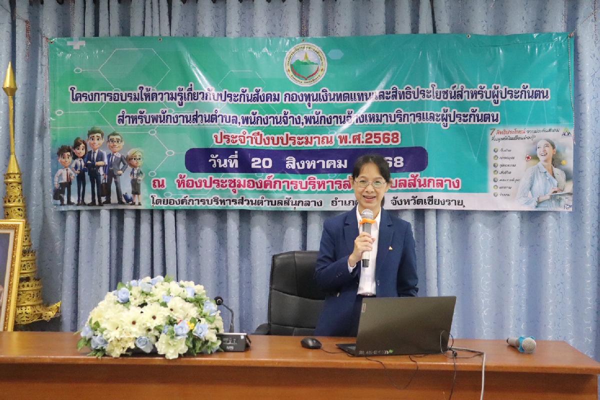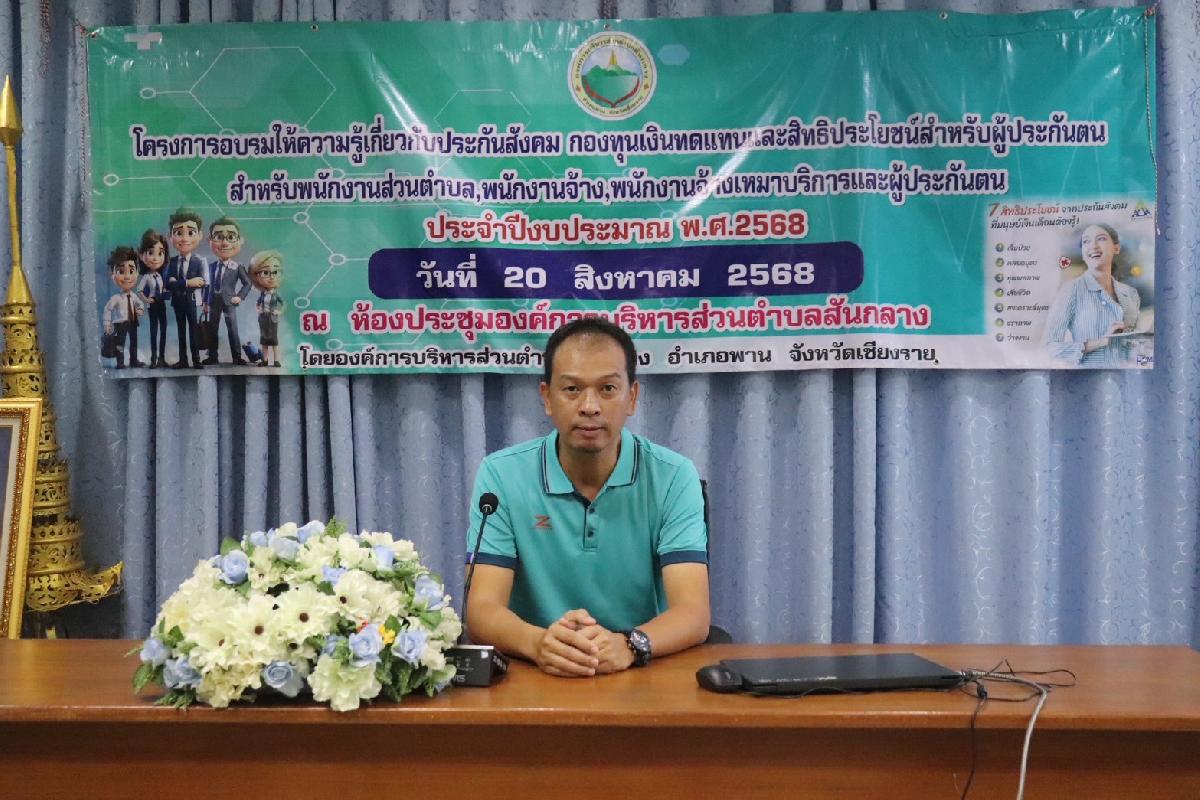 วันที่ 20 สิงหาคม 2568 เวลา 09.00 น. นายอลงกรณ์ ดีน้อย นายกองค์การบริหารส่วนตำบลสันกลาง เป็นประธานในพิธีเปิดโครงการอบรมให้ความรู้เกี่ยวกับประกันสังคม กองทุนเงินทดแทนและสิทธิประโยชน์สำหรับผู้ประกันตน ให้กับพนักงานเจ้าหน้าที่ อบต. จัดอบรม ณ ห้องประชุม อบต.สันกลาง ประกันสังคมเป็นหลักประกันในการดำเนินชีวิตของคนทำงาน ช่วยลดภาระความเสี่ยงที่อาจเกิดขึ้นได้ในการดำเนินชีวิต ไม่ว่าจะเป็นการเจ็บป่วย การรักษาพยาบาล การคลอดบุตร ทุพพลภาพ ว่างงาน สงเคราะห์บุตร ชราภาพ และเสียชีวิต ซึ่งจำเป็นอย่างยิ่งที่พนักงานทุกคนต้องมีความรู้ในเรื่องสิทธิต่างๆ สามารถยื่นคำขอสิทธิต่างๆได้อย่างถูกขั้นตอนและรวดเร็ว ขอขอบคุณวิทยากรจากสำนักงานประกันสังคมจังหวัดเชียงราย ให้ความรู้ความเข้าใจในเรื่องสิทธิต่างๆเกี่ยวกับประกันสังคมครั้งนี้