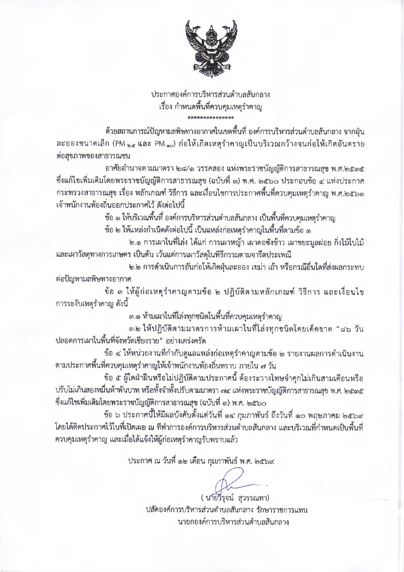 ประกาศองค์การบริหารส่วนตำบลสันกลาง เรื่อง กำหนดพื้นที่ควบคุมเหตุรำคาญ