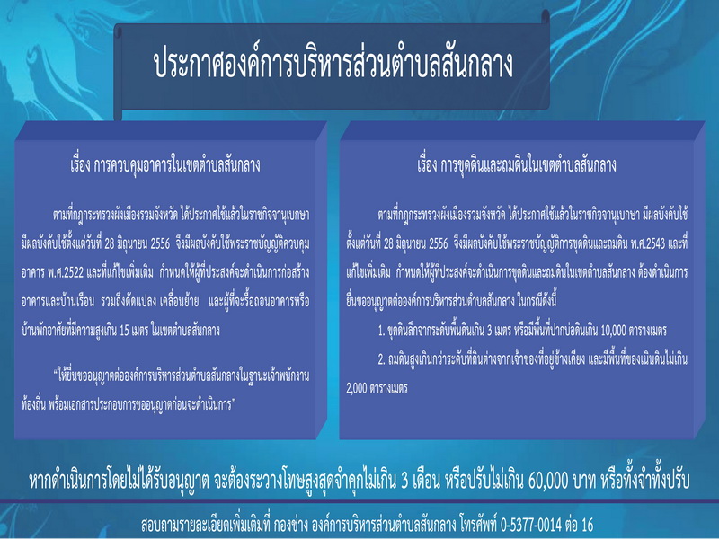 ประกาศการยื่นขออนุญาตก่อสร้างบ้าน อาคาร และการขุดดินถมดินในพื้นที่ตำบลสันกลาง