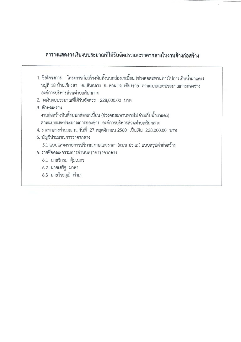 ราคากลางโครงการก่อสร้างหินทิ้งบนกล่องเกเบี้ยน หมู่ 18 บ้านเวียงสา