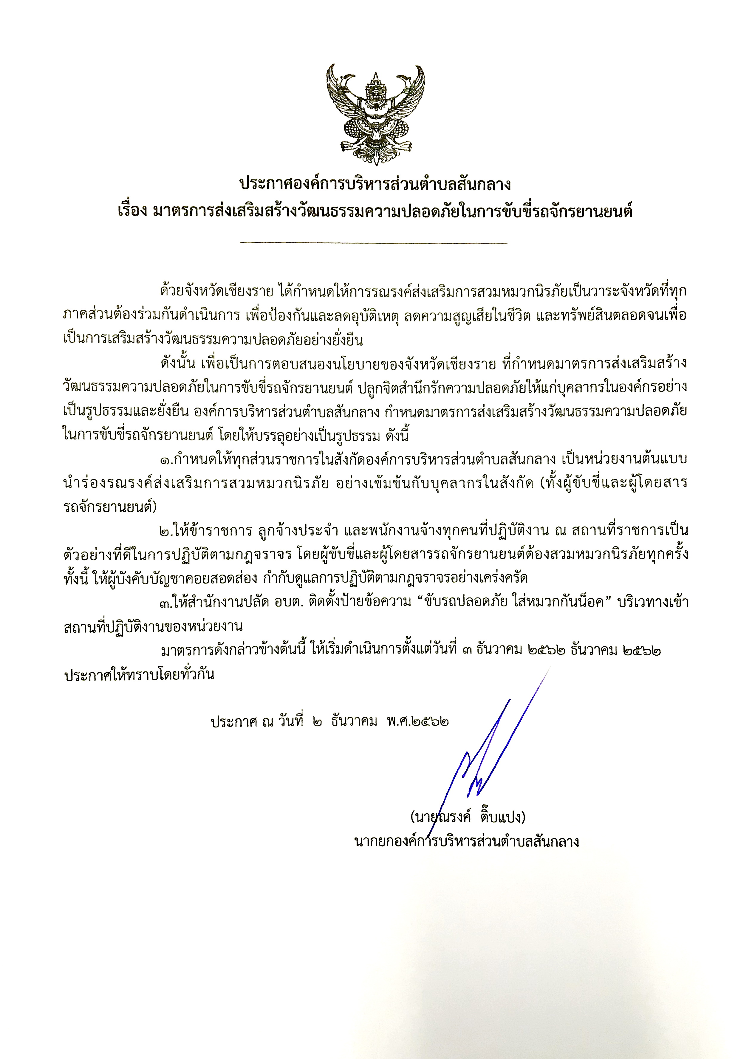 ประกาศมาตรการเสริมสร้างวัฒนธรรมความปลอดภัยในการขับขี่รถจักรยานยนต์
