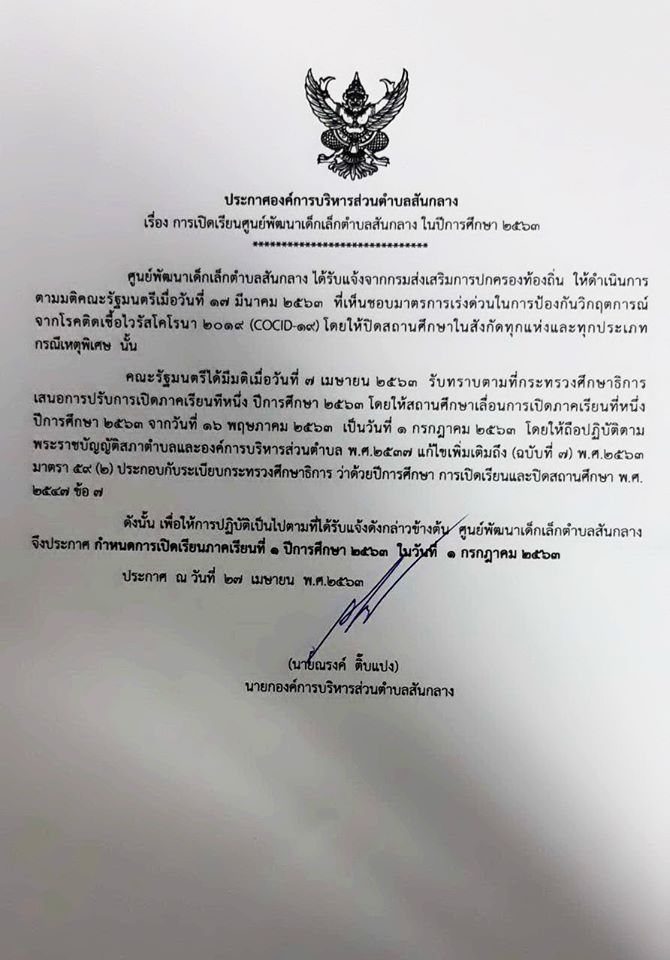 ประกาศเปิดการเรียนศูนย์พัฒนาเด็กเล็กตำบลสันกลาง ปีการศึกษา 2563 วันที่ 1 กรกฎาคม 2563