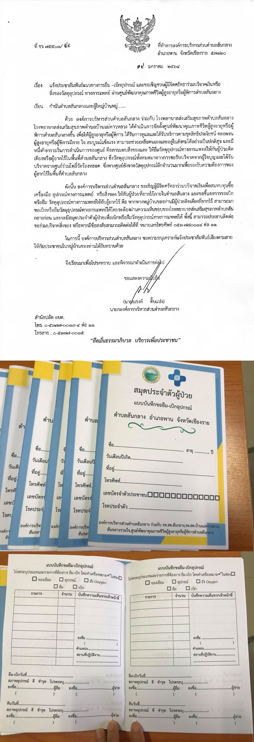 แนวทางการยืม-เบิกอุปกรณ์ และเชิญชวนบริจาคเงินหรือสิ่งของวัสดุอุปกรณ์ทางการแพทย์สมทบศูนย์พัฒนาคุณภาพชีวิตผู้สูงอายุหรือผู้พิการตำบลสันกลาง