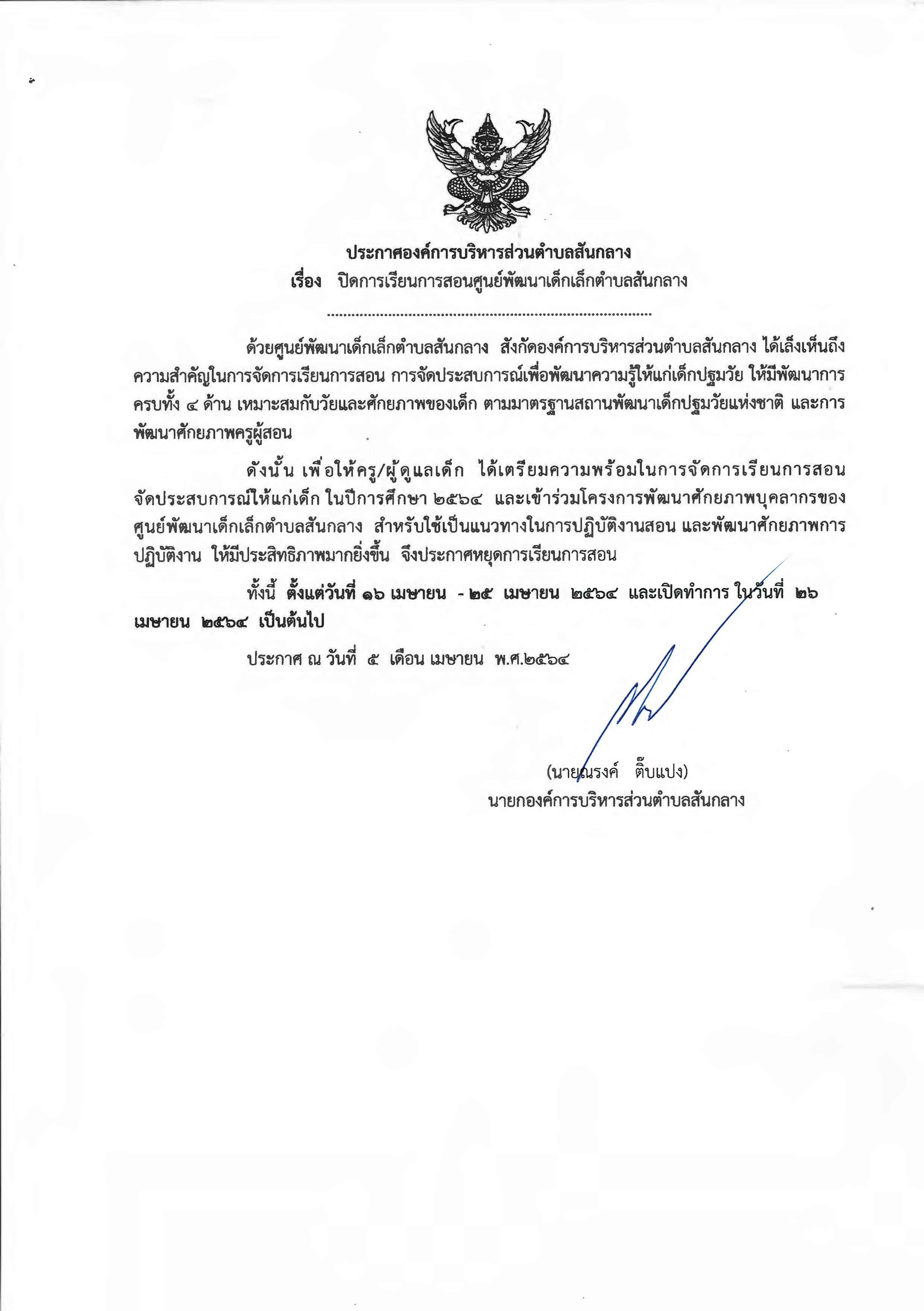 ประกาศปิดการเรียนการสอน ศูนย์พัฒนาเด็กเล็กตำบลสันกลาง 16-25 เมษายน 2564