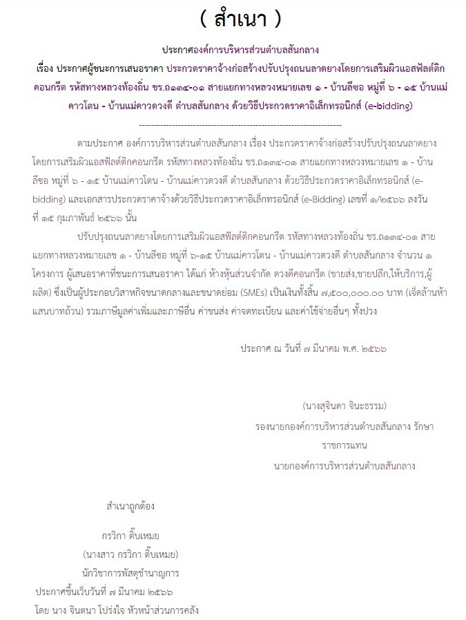 ประกาศผู้ชนะการเสนอราคาจ้างก่อสร้างปรับปรุงถนนลาดยางโดยการเสริมผิวแอสฟัลต์ติกคอนกรีต รหัสทางหลวท้องถิ่น ชร.ถ134-01 สายแยกทางหลวงหมายเลข 1 - บ้านลีซอ หมู่ที่ 6 - 15 บ้านแม่คาวโตน - บ้านแม่คาวดวงดี ตำบลสันกลาง ด้วยวิธีประกวดราคาอิเล็กทรอนิกส์ (e-bidding)