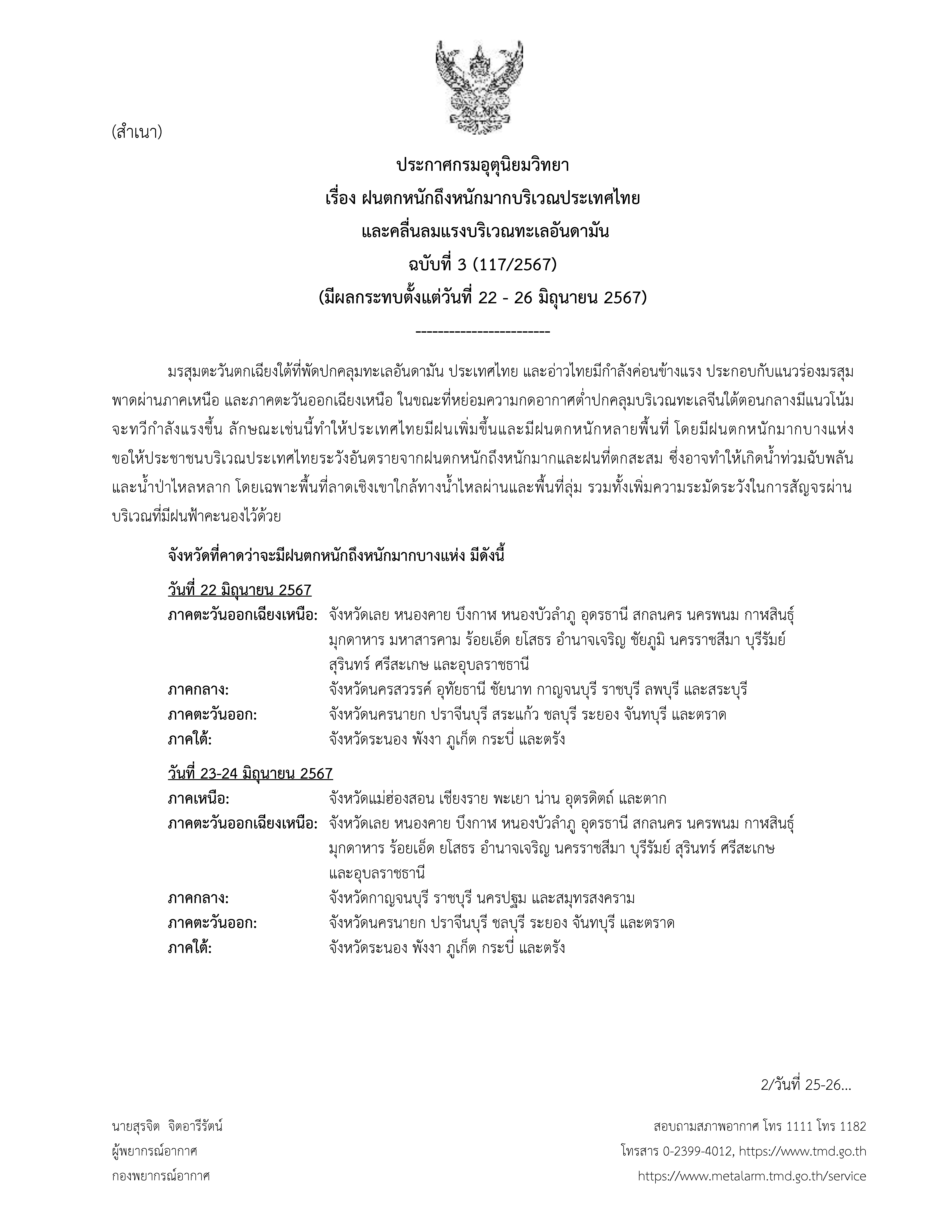 ประกาศกรมอุตุนิยมวิทยา ฉบับที่ 3 (117/2567)