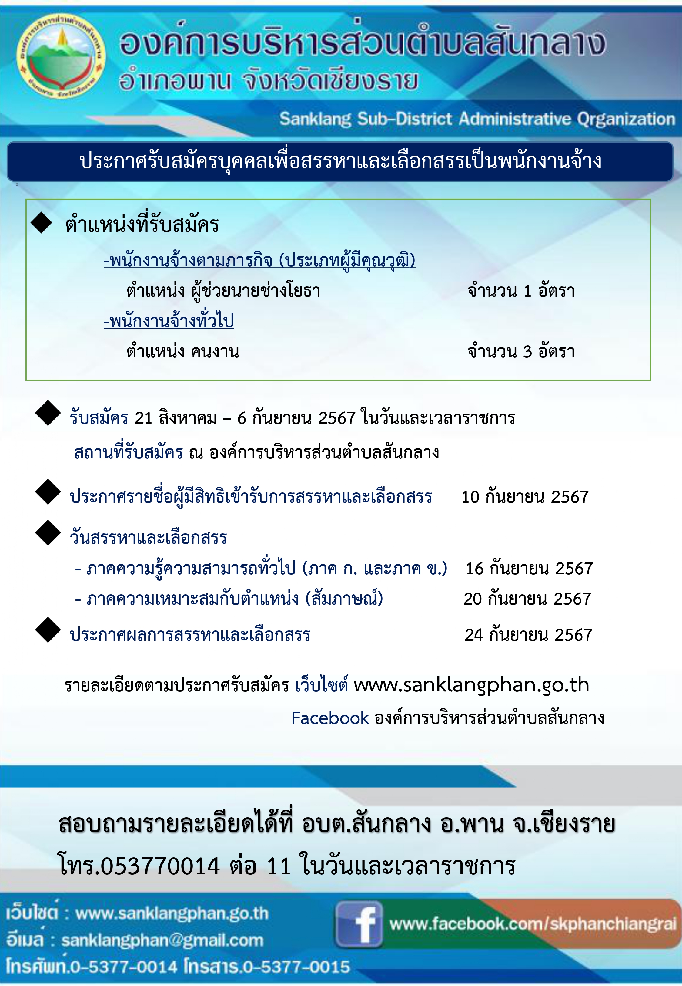 ประกาศรับสมัครบุคคลเพื่อสรรหาและเลือกสรรเป็นพนักงานจ้าง อบต.สันกลาง (ตำแหน่ง ผู้ชวยนายช่าง ,คนงาน)